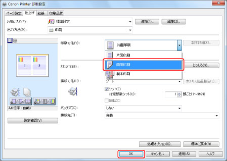 [印刷方法]から[両面印刷]を選択して、[OK]をクリックします。