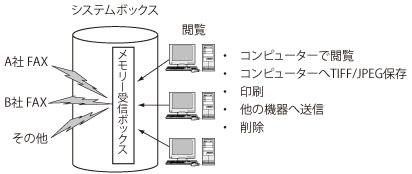 システムボックスの格納領域は「メモリー受信ボックス」と呼ばれます。すべてのメモリー受信文書は「メモリー受信ボックス」1箇所に集まるため、一元管理ができます。