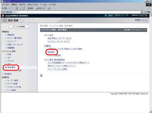 リモートUIにアクセスして[設定/登録]→ファンクション設定の[受信/転送]→[転送設定]をクリックします。