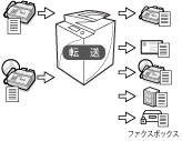 本体で受信したファクスを他の宛先に自動的に転送するよう設定できます。例えば別の事業所に出かけている担当者宛てに届いたファクスを、出先の事業所に自動的に転送できます。