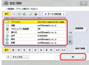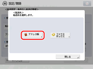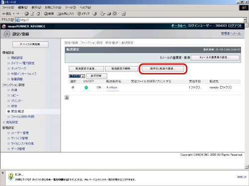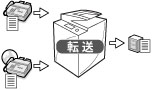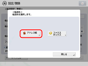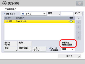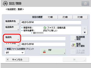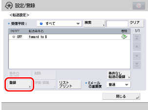 (設定/登録)→[ファンクション設定]→[受信/転送] →[共通設定]→[転送設定]→[登録]を押します。