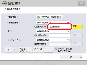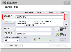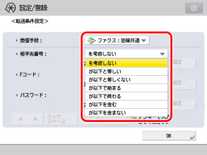 相手先ファクスの基本登録番号は、ゼロ発信、スペース、国番号を利用している場合があります。これらの有無で転送条件は変わりますので気をつけましょう。有無が不明である場合は、[が以下と等しい]を選ばず、[が以下を含む]を設定するとよいです。