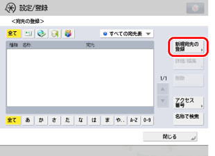 (設定/登録)→[宛先設定]→[宛先の登録]→[新規宛先の登録]を押します。