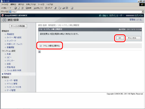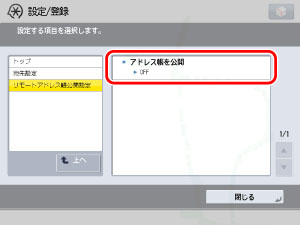 リモートUIにアクセスして、[設定/登録]→[宛先設定]→[リモートアドレス帳公開設定]をクリックします。