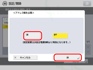 (設定/登録)→[宛先設定]→[リモートアドレス帳公開設定]→[アドレス帳を公開]を押します。