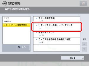 (設定/登録)→[宛先設定]→[リモートアドレス帳取得設定]→[リモートアドレス帳サーバーアドレス]を押します。
