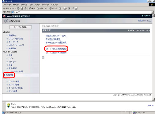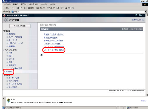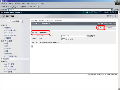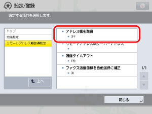 リモートUIにアクセスして、[設定/登録]→[宛先設定]→[リモートアドレス帳取得設定]をクリックします。