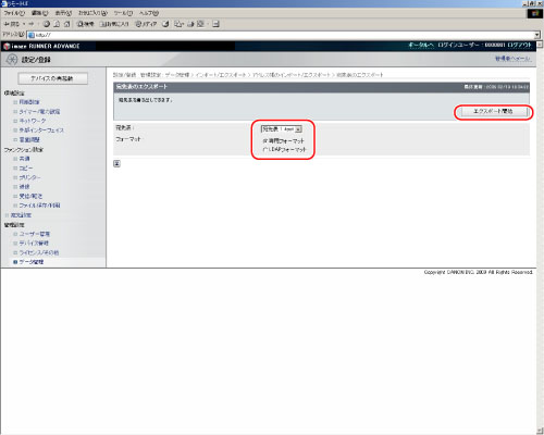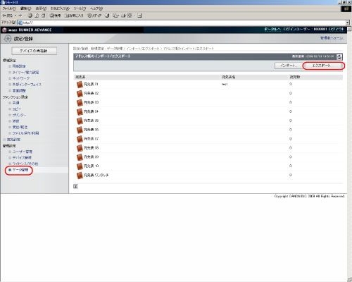 [設定/登録]をクリックして、管理設定に表示されるメニューから[データ管理]を選択したあと、[個別インポート/エクスポート]→[宛先表]→[エクスポート...]をクリックします。