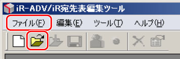 iR-ADV/iR宛先表編集ツールを起動し、メニューバーの[ファイル]→[開く]をクリックするか、またはツールバーの[開く]をクリックします。