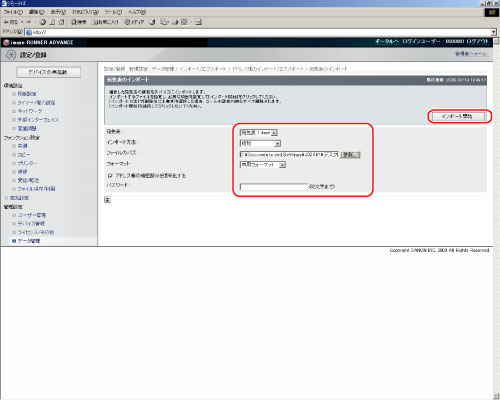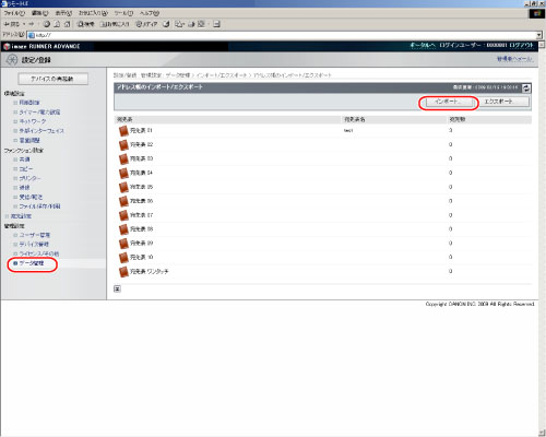 [設定/登録]をクリックして、管理設定に表示されるメニューから[データ管理]を選択したあと、[個別インポート/エクスポート]→[宛先表]→[インポート...]をクリックします。