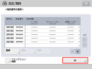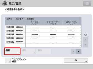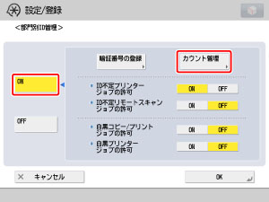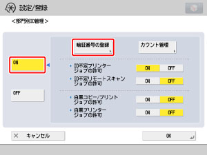 部門ID、暗証番号の設定をしたあと、[制限のON/OFFと制限面数の設定]を押します。