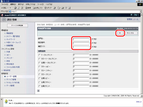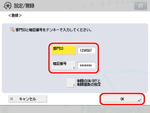 部門ID、暗証番号、確認入力を入力して[OK]をクリックします。