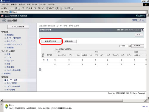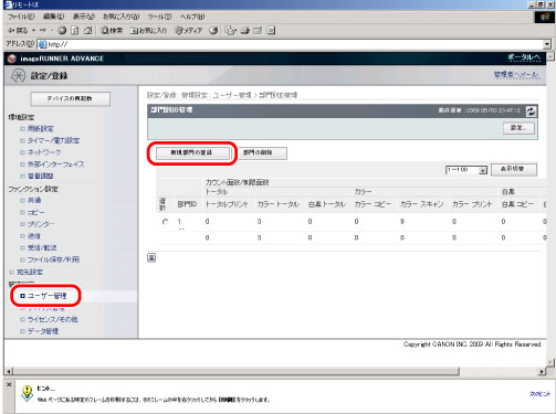 リモートUIにアクセスして、[設定/登録]→[ユーザー管理]→[部門別ID管理]をクリックしたあと、[新規部門の登録]をクリックします。