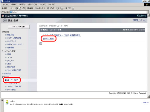 リモートUIにアクセスしたあと、[設定/登録]→[ユーザー管理]→[部門別ID管理]をクリックします。