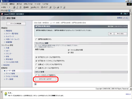 リモートUIにアクセスして、[設定/登録]→[ユーザー管理]→[部門別ID管理]をクリックします。