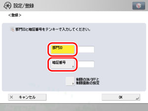 [部門ID/暗証番号の設定]ダイアログボックスが表示されます。