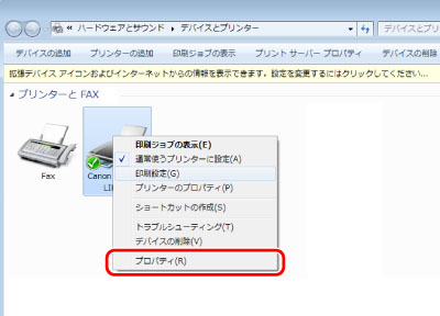 印刷設定を行うプリンターのアイコンを右クリックして、[プロパティ]をクリックします。