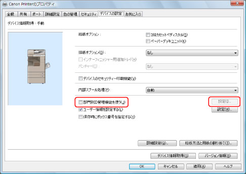 [部門別ID管理機能を使う]にチェックマークを付けて、[設定]をクリックします。