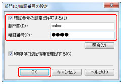 [ID/パスワードの確認]ダイアログが表示され、正しいIDとパスワードを入力して[OK]をクリックすると印刷が開始されます。部門ごとの印刷枚数が、本体でカウントされます。