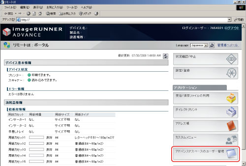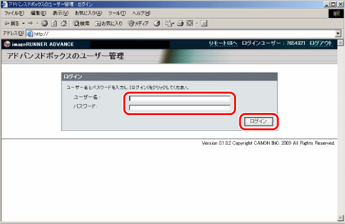 リモートUIを起動しWebブラウザーのアドレス入力欄に以下のURLを入力して、[管理者ログイン]をクリックします。