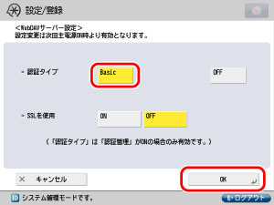 以下の手順でWebDAVサーバー設定の認証管理を[Basic]に設定します。