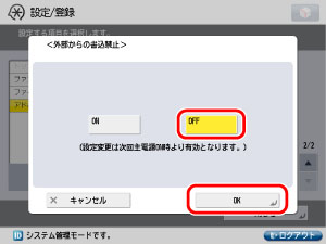 (設定/登録)→[ファンクション設定]→[ファイル保存/利用]→[アドバンスドボックス設定]→[外部からの書込禁止]