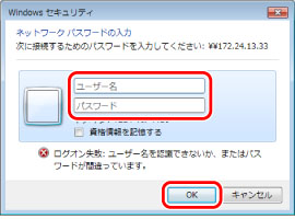 「ユーザー情報の登録」の手順5で設定したユーザー名とパスワードを入力し、[OK]をクリックします。
