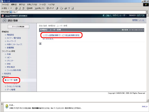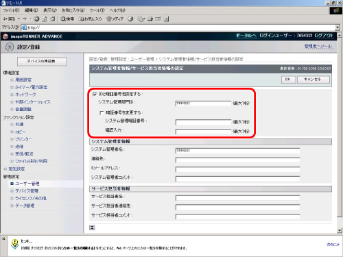 リモートUIにアクセスして、[設定/登録]→[ユーザー管理]→[システム管理者情報/サービス担当者情報の設定]をクリックします。