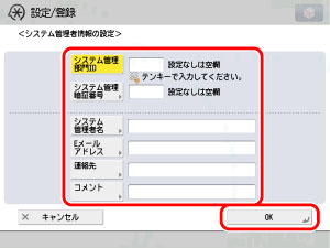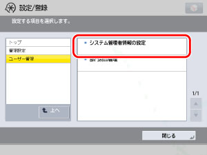 (設定/登録)→[管理設定]→[ユーザー管理]→[システム管理者情報の設定]を押します。