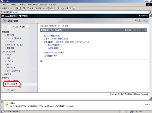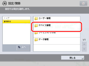 (設定/登録)→[管理設定]→[デバイス管理]を押します。