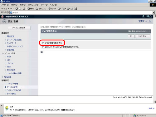 (管理ソフトからのジョブ履歴取得)[許可する]または[許可しない]を選択したあと、[OK]を押します。