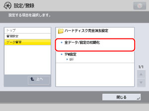 (設定/登録)→[管理設定]→[データ管理]→[全データ/設定の初期化]を押します。