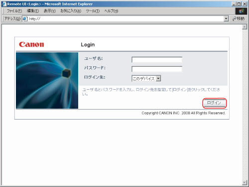 アドレス入力欄に以下のURLを入力してリモートUIを起動して、表示された項目を入力したあと、[ログイン]をクリックします。