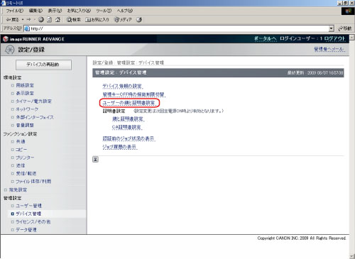(設定/登録)→[管理設定]→[デバイス管理]→[証明書設定]→[鍵と証明書リスト]→[ユーザーの鍵と証明書リスト]を押します。