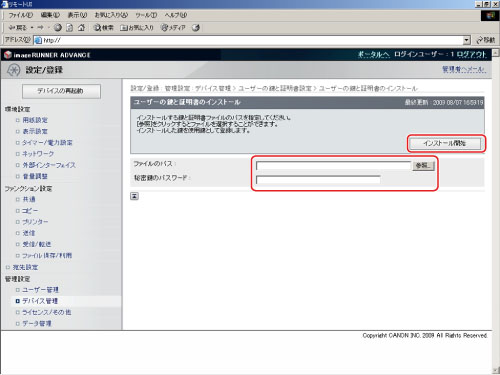 リモートUI上でのユーザーの鍵と証明書リストのインストール