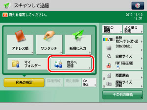 原稿をフィーダーまたは原稿台ガラスにセットしたあと、[スキャンして送信]を押します。