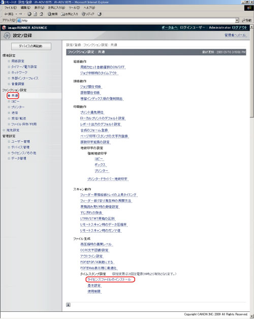[設定/登録]をクリックして、表示されるメニューから[共通]を選択したあと、[ライセンスファイルのインストール]をクリックします。