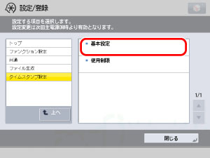 (設定/登録)→[ファンクション設定]→[共通]→[ファイル生成]→[タイムスタンプ設定]→[基本設定]を押します。