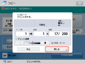 先行するジョブの終了後にコピーが開始します。[ジョブの予約がいっぱいか、プリンターが準備中です。しばらくたってからもう一度実行してください。]というメッセージが表示された場合は、[OK]を押して前のジョブが終了したあとに操作をやりなおしてください。