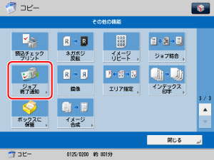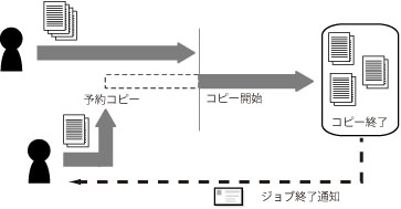 ジョブ実行中は、実行中ジョブが終了しないと次のジョブを実行できません。たとえば、大量のコピーが実行されている場合は、コピーがすべて終わるまで待つことになります。そのようなときには、予約コピー機能を使用すれば、コピー中でも原稿の読み込みができ、実行中コピーが終わり次第コピーを開始できます。また、自分のコピーが終了したら通知を受け取れるよう設定することで、効率よくコピーを実行できます。