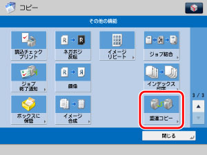(設定/登録)→[ファンクション設定]→[コピー]→[重連コピーの通信タイムアウト]を押します。|