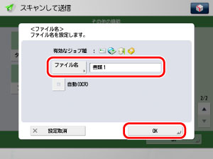ファイル形式にPDF(OCR)またはXPS(OCR)を選択しているときに、[自動(OCR)]を「ON」にすると、送信文書の先頭からタイトル候補となる文字列を抽出して、ファイル名を自動的に作成します。