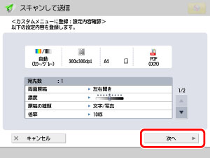 登録するボタンの呼び出し時の設定をしたあと、[次へ]を押します。