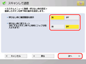 [ON]に設定した場合は、登録したボタンを呼び出したとき、設定内容の確認画面が表示されます。設定内容の確認画面については、「登録したカスタムメニューボタンから送信する」を参照してください。[OFF]に設定した場合は、登録したボタンを呼び出したとき、設定内容の確認画面が表示されません。