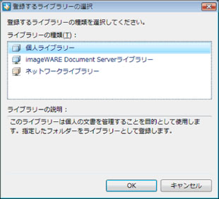 imageWARE Desktopでは、フォルダーや文書の保管をライブラリーで行います。ライブラリーには、個人ライブラリーと共有ライブラリー(Document Server上のライブラリー)があります。個人ライブラリーは、個人PC上のフォルダーだけでなく、ネットワーク上のコンピューターのフォルダーを指定して作成することもできます。