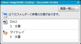 Document Monitorを使用して、アドバンスドボックス内のフォルダーを監視することができます。imageWARE Desktop で監視フォルダーの設定を行い、Document Monitorで新着文書の通知設定を行うと、アドバンスドボックスのフォルダーへの保存時に、新着文書通知アイコン、および新着文書通知ウィンドウが表示されます。
