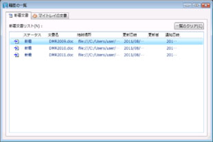 新着文書通知アイコンをダブルクリック、または新着文書通知ウィンドウの[履歴一覧]をクリックすると、[履歴の一覧]画面が表示されます。[履歴の一覧]画面で[新着文書リスト]の項目を選択してダブルクリックすると、Desktop Browserが起動し、新着文書のあるフォルダーの中の項目がファイルリストビューペインに表示されます。