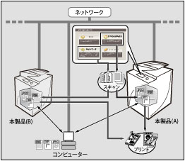 imageRUNNER ADVANCEから読み込んだ原稿を、PDF、JPEG、TIFF、XPSなどのファイル形式で保存したり、ファイルをimageRUNNER ADVANCEからプリントしたりできます。