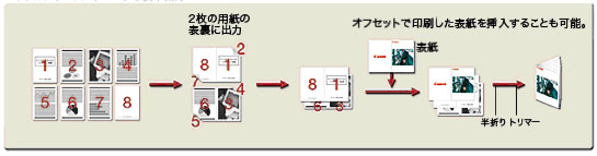 指定したサイズ/向きの出力用紙1枚につき、原稿2ページ分を、中とじ製本後のページ順にあわせて自動的に面付けし、出力することができます。またその際、表紙を挿入することも可能です。