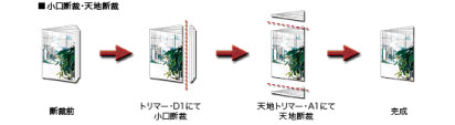 プリンタードライバーの[印刷設定]画面-[仕上げ]シート-[中とじの設定]で[折り+中とじ+断裁]を選択し、[断裁幅の調整]で断裁幅を設定します。ご使用のオプションによっては、[折り+中とじ+断裁]を選択できない場合があります。また、ご使用のオプションによっては、天地断裁を行うことができず、小口断裁のみとなる場合があります。小口断裁には、オプションのトリマーが必要です。三方断裁には、オプションのトリマー、および天地トリマーが必要です。